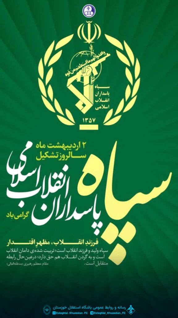 باشگاه فرهنگی ورزشی استقلال خوزستان، در دومین روز از ماه اردیبهشت، سالروز تأسیس نهادِ مقدس، انقلابی و مردمیِ «سپاه پاسداران انقلاب اسلامی» را که با فرمان تاریخی و الهی حضرت امام خمینی (ره) بنا نهاده شد، فرصتی غنیمت می‌شمارد تا تجلیل و سپاس خود را از جانفشانی‌های دلاورانی به جای آوریم که در تمامی عرصه‌های امنیت، دفاع، خدمت و سازندگی، همواره در خط مقدمِ پاسداری از آرمان‌های بلند انقلاب و منافع ملی ملت شریف ایران ایستاده‌اند.